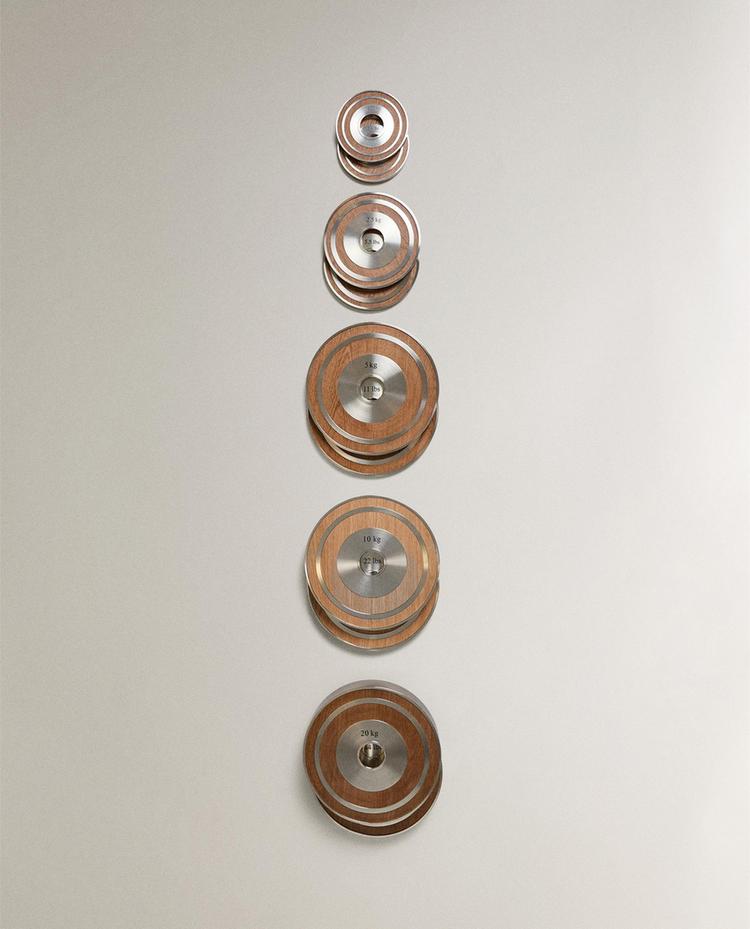 Conjunto de pesos com forma de disco, elaborados em madeira de carvalho e aço. Inclui duas peças do mesmo tamanho, com o peso indicado em kg e lb. Útil como acessório para treinos de força e tonificação.