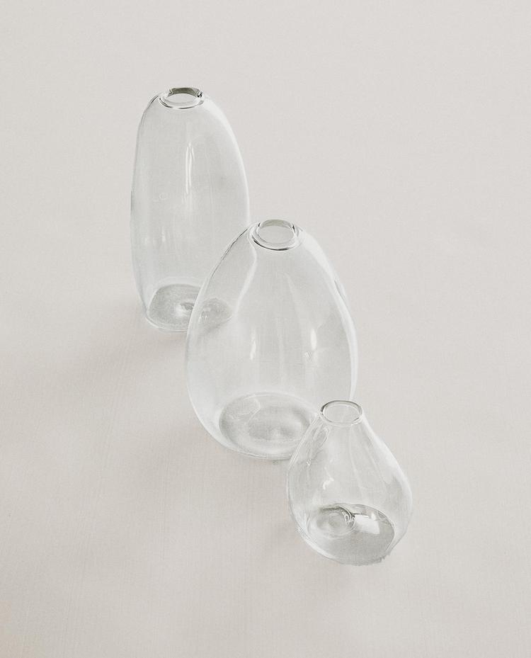 Vaso de cristal com forma cilíndrica irregular com um efeito similar ao das bolhas ou o vidro inflado e dispõe de uma boca estreita.