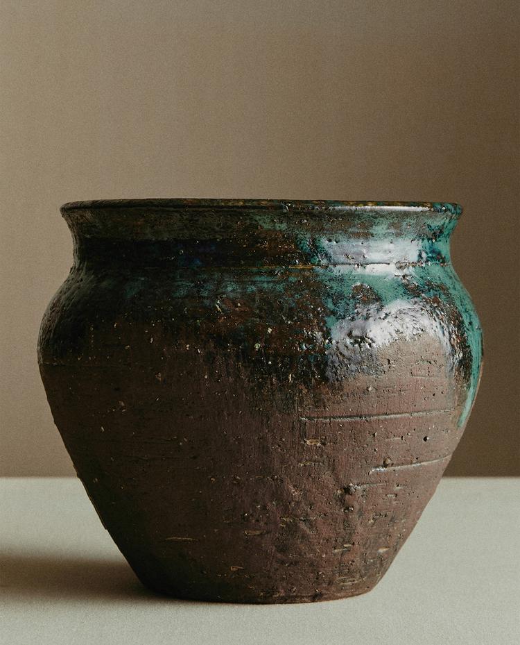 Vaso elaborado em terracota. A base tem forma de ovalo alongado com acabamento mate. O pescoço, largo e curto, vai se alargando em direção à parte superior e tem um esmaltado brilhante aplicado de forma irregular, gerando um efeito visual tipo "gotejamento".