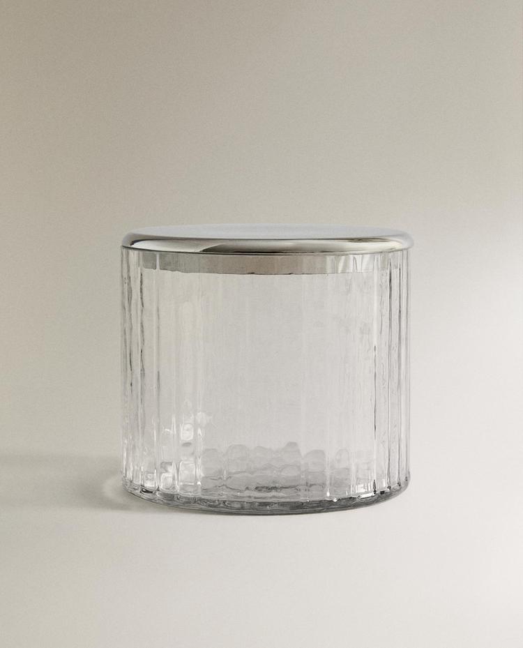 Transparent glass bathroom soap dispenser with a vertical raised design across the entire surface, cylindrical shape, and a glossy top finish.