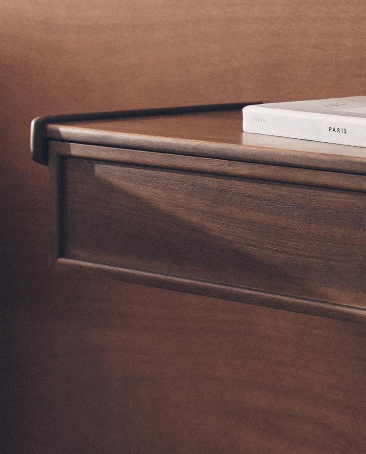 Rubberwood nightstand with appliqués for placing on the wall. It has a drawer for storage.