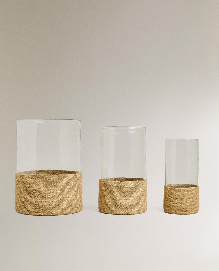 Cylindrical glass lantern with a jute base. Available in several sizes.