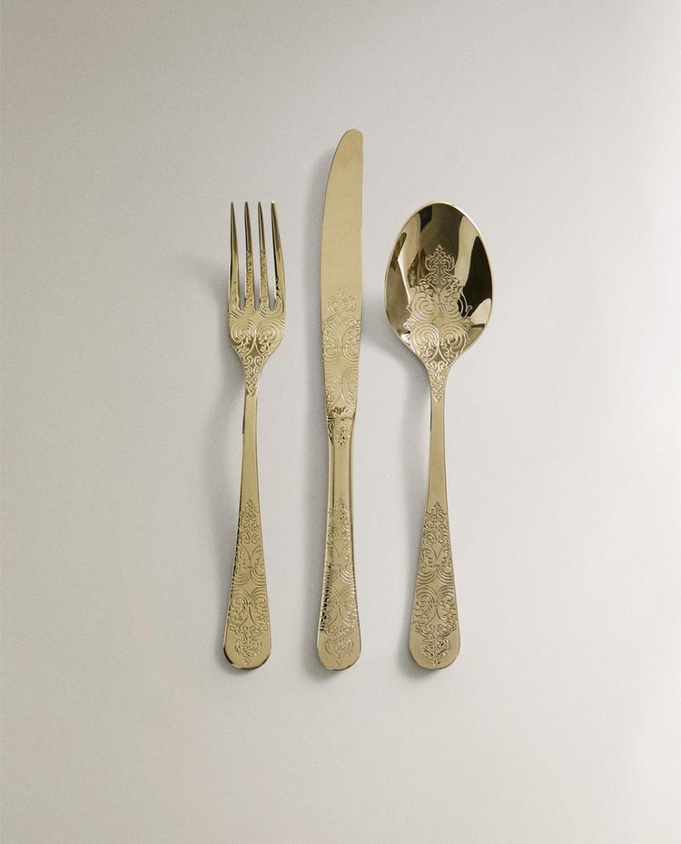 Couverts composés d'une fourchette, d'un couteau et d'une cuillère en acier avec un motif gravé et une finition brillante.
