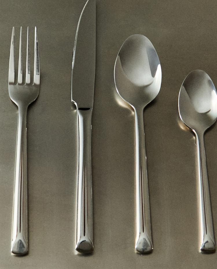 Couverts composés d’une fourchette, d’un couteau, d’une cuillère et d’une cuillère à dessert, tous avec une finition polie et un design minimaliste