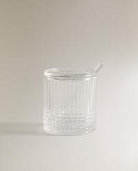 SUCRIER VERRE RELIEF GÉOMÉTRIQUE 35.90 CADTRANSPARENT|6289/217/990Sucrier en verre. Design avec motif géométrique en relief de rayures verticales et de carrés sur la base. Comprend une cuillère et un couvercle.Capacité: 310 mlAjouter