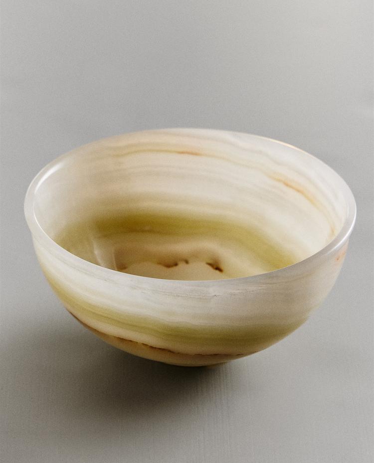 Petit bol en onyx vert massif. Forme surélevée sur une base intégrée avec une ouverture supérieure douce. Présente des veines et des variations chromatiques propres au matériau et à la finition.