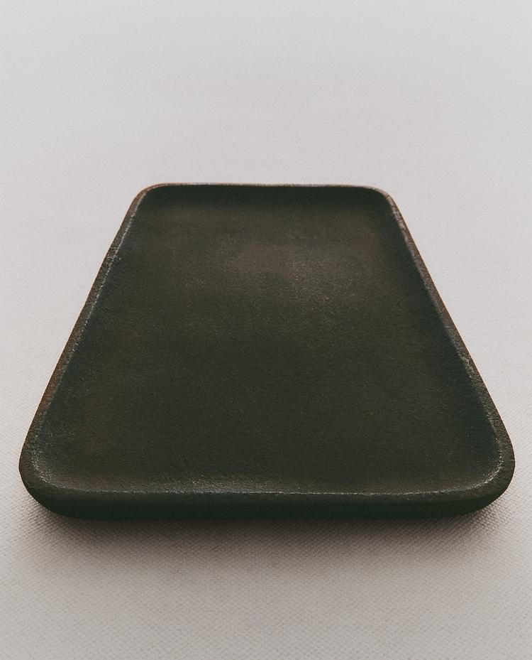 Plateau décoratif en métal de forme rectangulaire avec des bords relevés et arrondis.