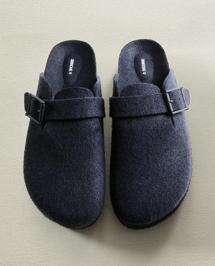 Chausson type sabot en feutre avec boucle assortie ton sur ton.