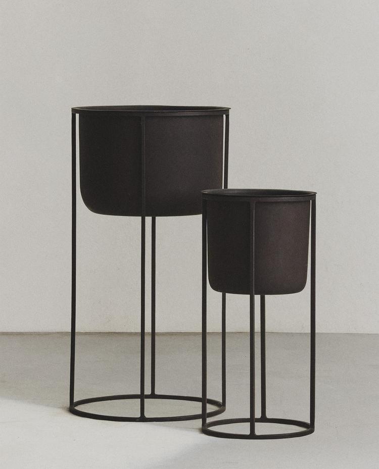 Planter with stand, made of black metal with a matte finish.