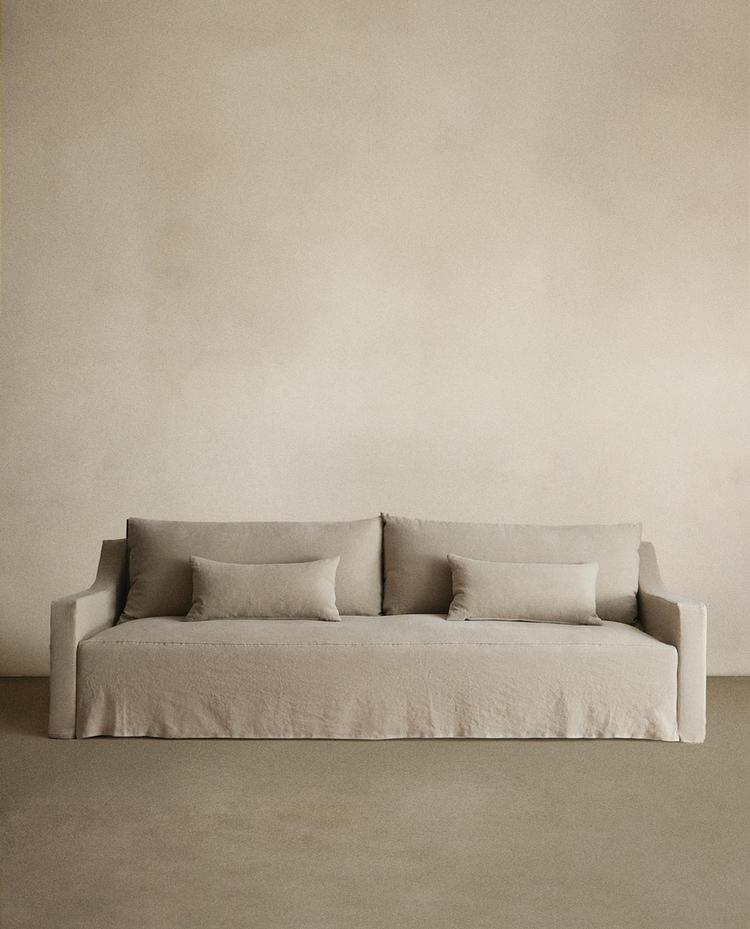 Slipcover couch made with washed linen fabric, crafted with an internal wooden frame lined with foam, a spring base in the seat, and beech wood legs. The springs are, in turn, covered by a foam mattress and a layer of down, which provide a greater sense of comfort. Therefore, we recommend fluffing this last layer at least once a week to evenly distribute the down and filling.