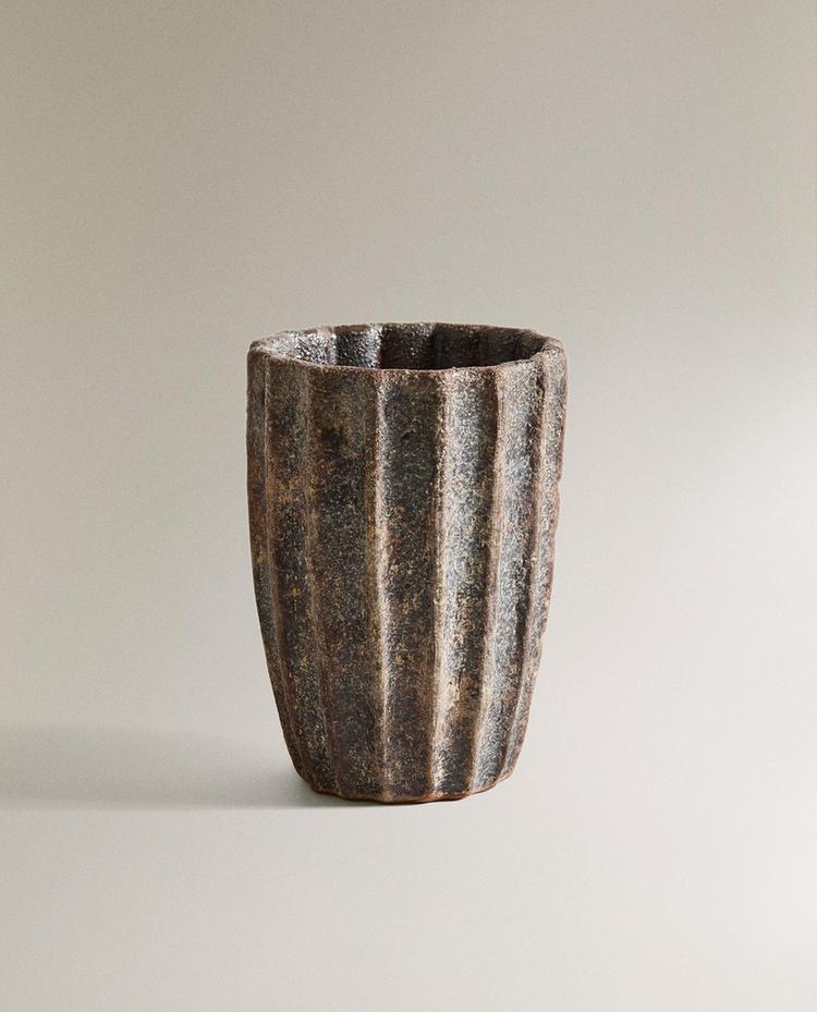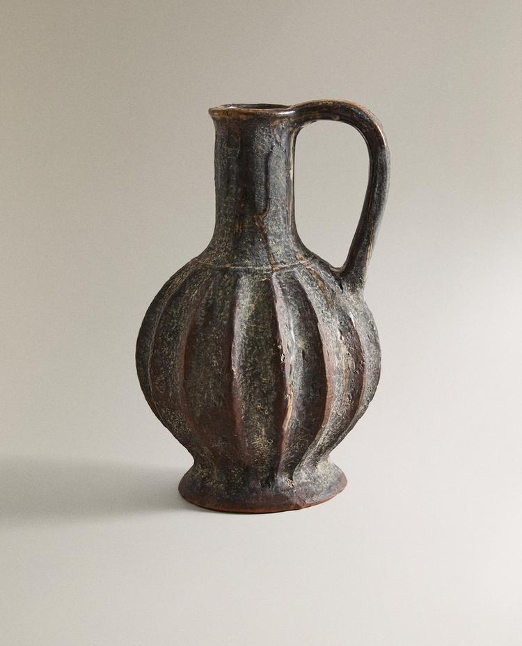 Seifenspender für das Bad aus Terrakotta mit handwerklichem Design und gealterter brauner Oberfläche mit plissiertem Relief, mit einem Spender aus Metall mit silbernem Finish.