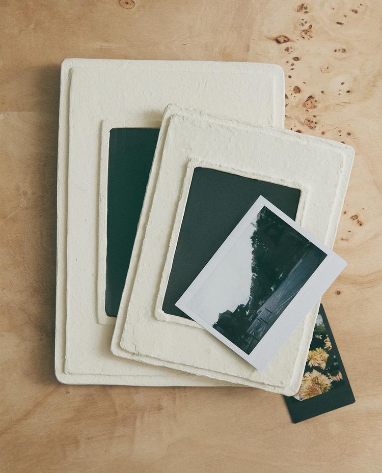 Bilderrahmen aus Papier im rechteckigen Format. Das Design verfügt über eine innere Vertiefung, die das Bild umrahmt und einen Tiefeneffekt erzeugt.
