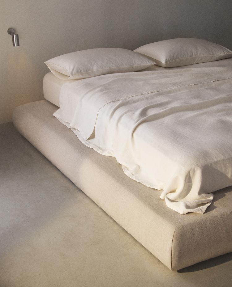 Quilted mattress base with removable upholstery made of a linen and cotton blend. Dry cleaning. Inner wooden structure.