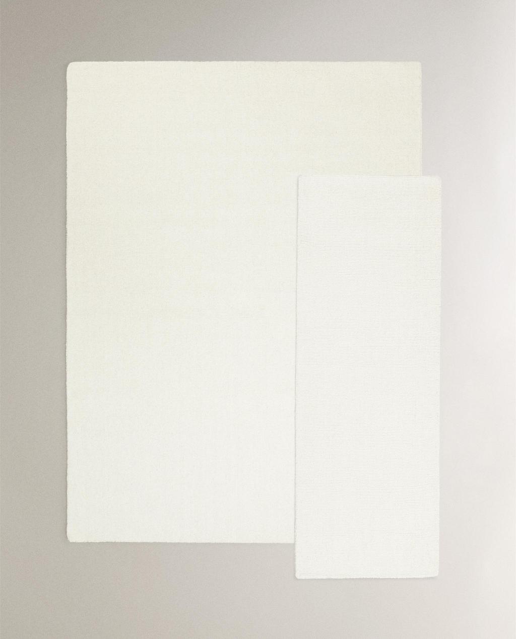 Ecru wool rug with yarn manually inserted using a tufting technique.