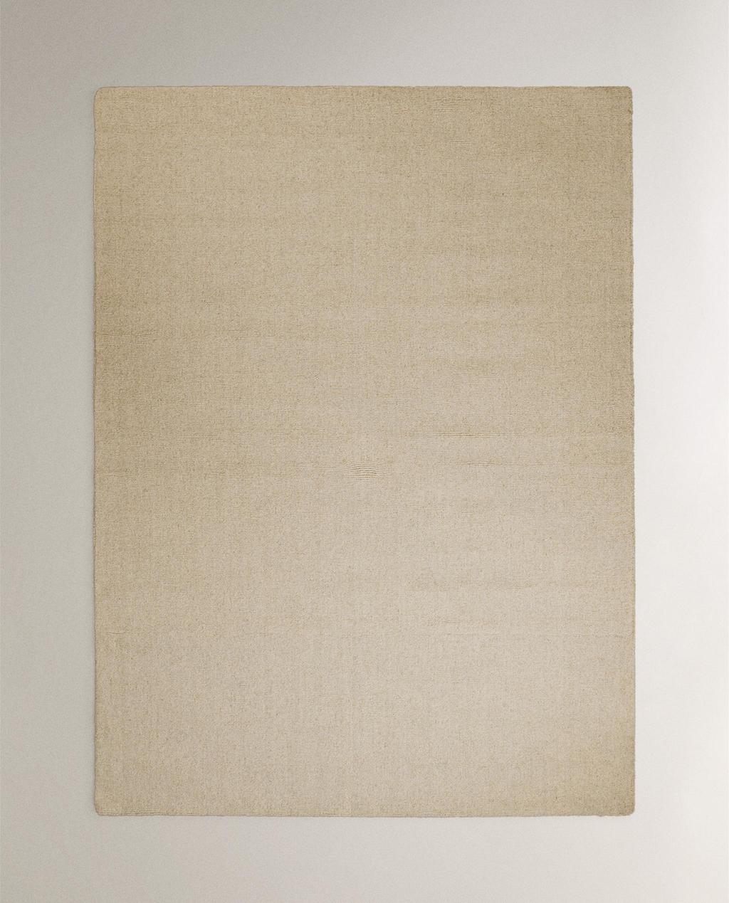 Ecru wool rug with yarn manually inserted using a tufting technique.
