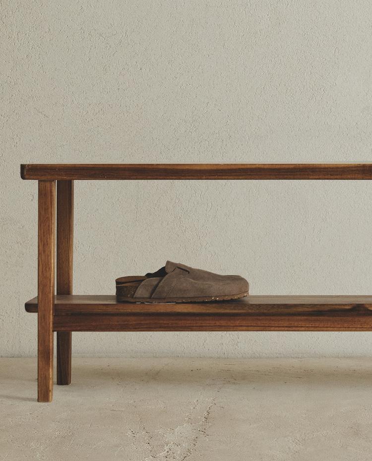 Banquette double avec étagère inférieure, fabriquée en bois d'acacia. Distance du siège au sol : 43cm.