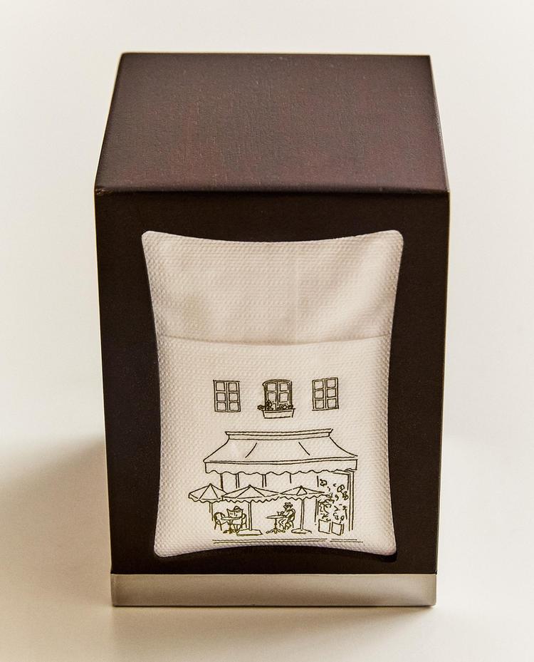 Ensemble composé d’un porte-serviettes en bois aux lignes droites, qui comprend 100 serviettes en papier à l’intérieur avec un motif illustré d’inspiration cafetière, avec des scènes de personnes.