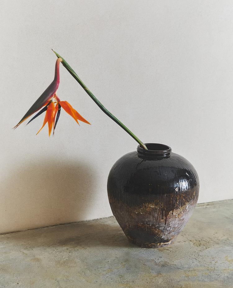 Vase en grès à la finition émaillée, de forme arrondie et avec une texture à rayures verticales.