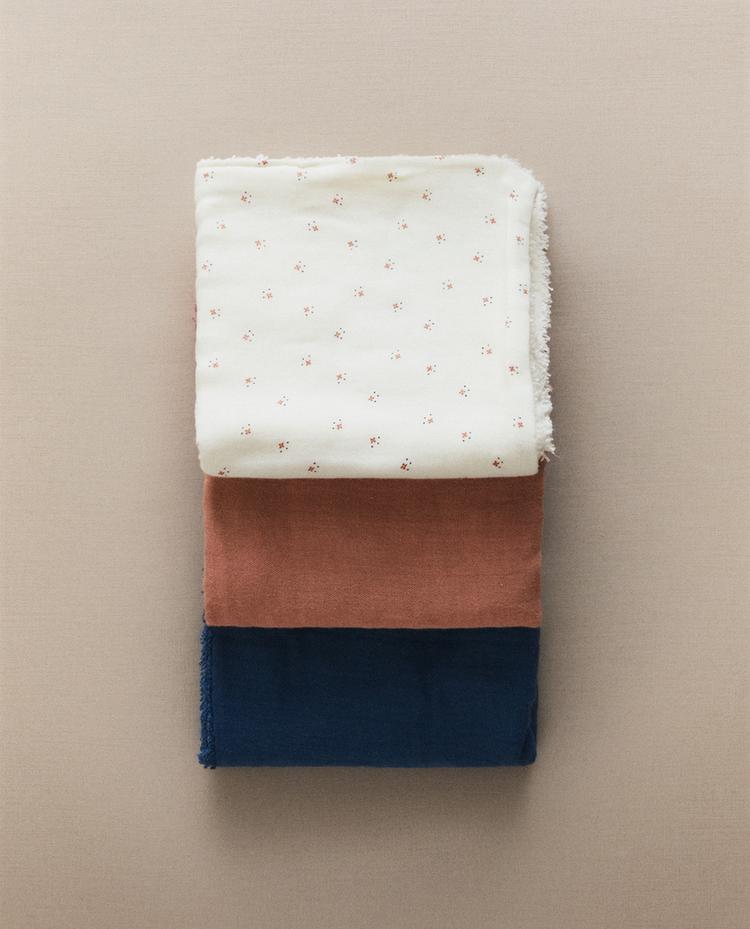 Mini serviettes bébé confectionnées en coton éponge et gaze, deux d'entre elles avec un motif floral et l'autre de couleur unie.