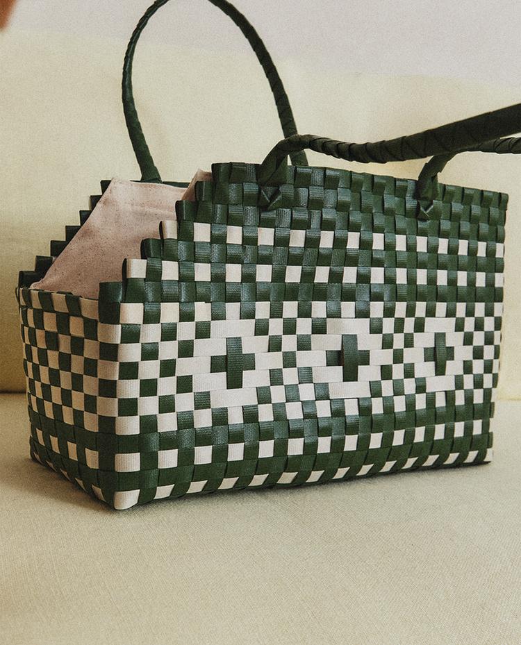 Sac de transport pour animaux de compagnie avec motif tressé et combinaison de couleurs contrastantes. Il est doté de deux anses et d'une doublure intérieure en coton. Comprend une ouverture latérale qui permet à l'animal de passer confortablement la tête.
