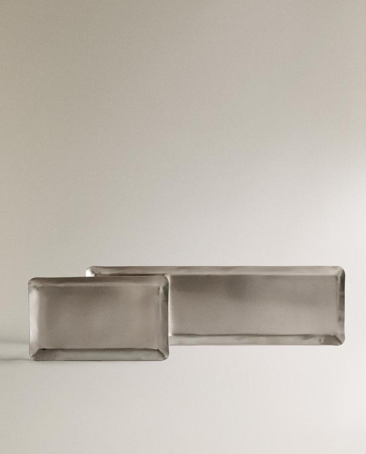 Plateau vide-poches décoratif en métal de forme rectangulaire avec une finition mate. Disponible en deux tailles.