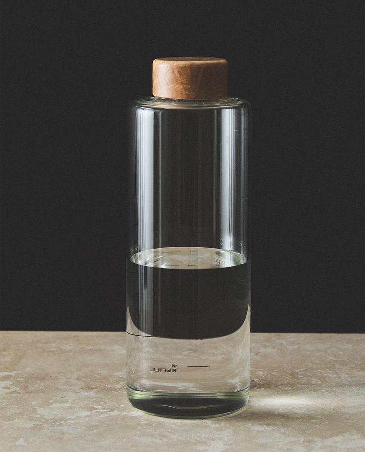 Bottiglia riempibile in borosilicato con tappo a vite in legno di rovere. Gli indicatori ricordano la quantità di acqua che si consiglia di bere ogni giorno per essere sempre idratati.
