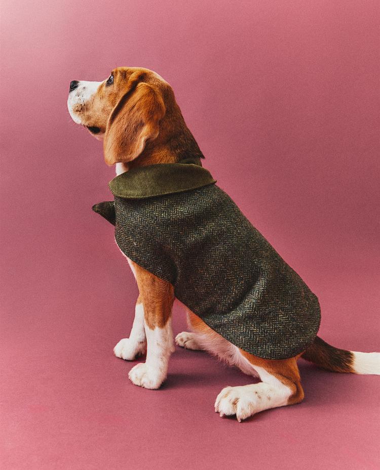 Cappotto per animali domestici realizzato in lana con interno a quadri e sciarpa tubolare in velluto a coste. Chiusura centrale.