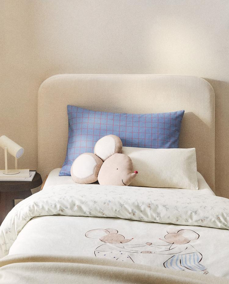 Copripiumino per bambini in cotone slavato a 200 fili. Presenta un design double-face, con piccoli motivi di topolini, formaggi e fiori su un lato, e due topi più grandi sull'altro.