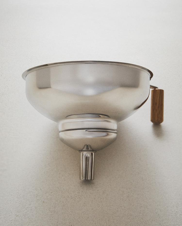 Imbuto in acciaio inossidabile con bocchetta per un versamento preciso. Incorpora un colino rimovibile e ha un manico in legno di quercia che facilita una presa comoda e sicura, consentendo di travasare liquidi in modo semplice e controllato.