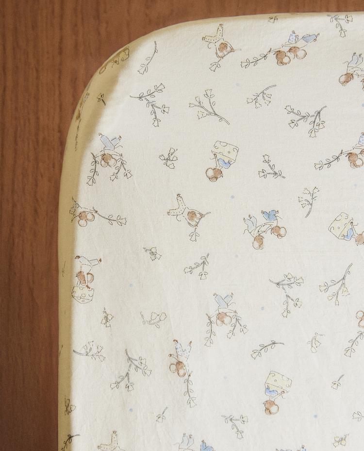 Lenzuolo con angoli per bambini in cotone slavato a 200 fili. Presenta un motivo con piccoli topolini, formaggi e fiori.
