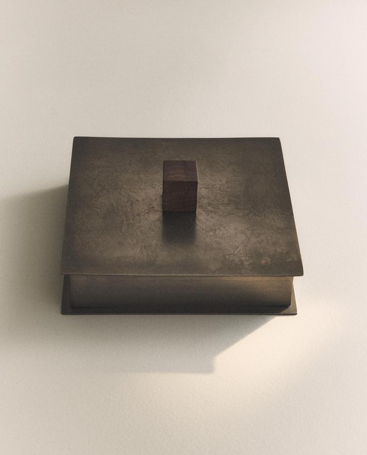 Scatola quadrata con coperchio realizzata in acciaio inossidabile con finitura anticata e pomolo in legno di mango. Disponibile in due misure.