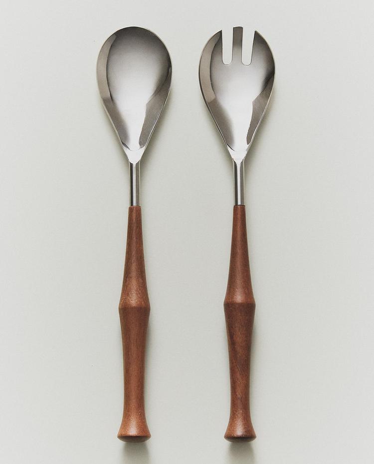 Set di posate da insalata in acciaio inossidabile con manico in legno di acacia.