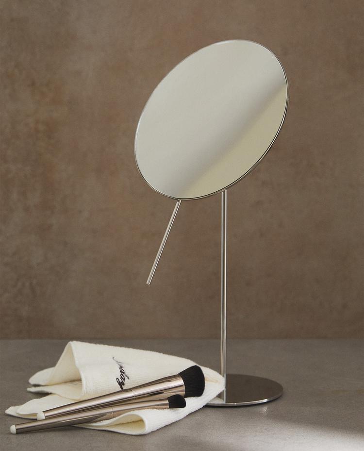 Specchio per il trucco ingrandente con struttura metallica e base rotonda. Design orientabile che permette di regolare l'inclinazione.