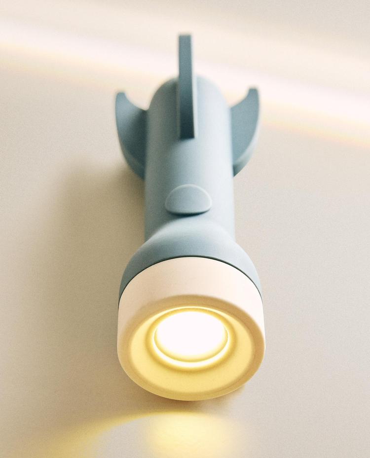 Kinder-Taschenlampe mit LED-Licht, wiederaufladbarem Akku und Raketenform. Ihr Design ermöglicht es, sie dank der Raketenflossen an der Unterseite in verschiedenen Positionen zu platzieren.