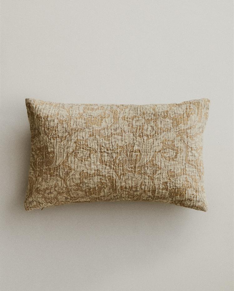 Kissenbezug aus einer Baumwoll-Leinen-Mischung mit bedruckten Blumenmotiven in Brauntönen.