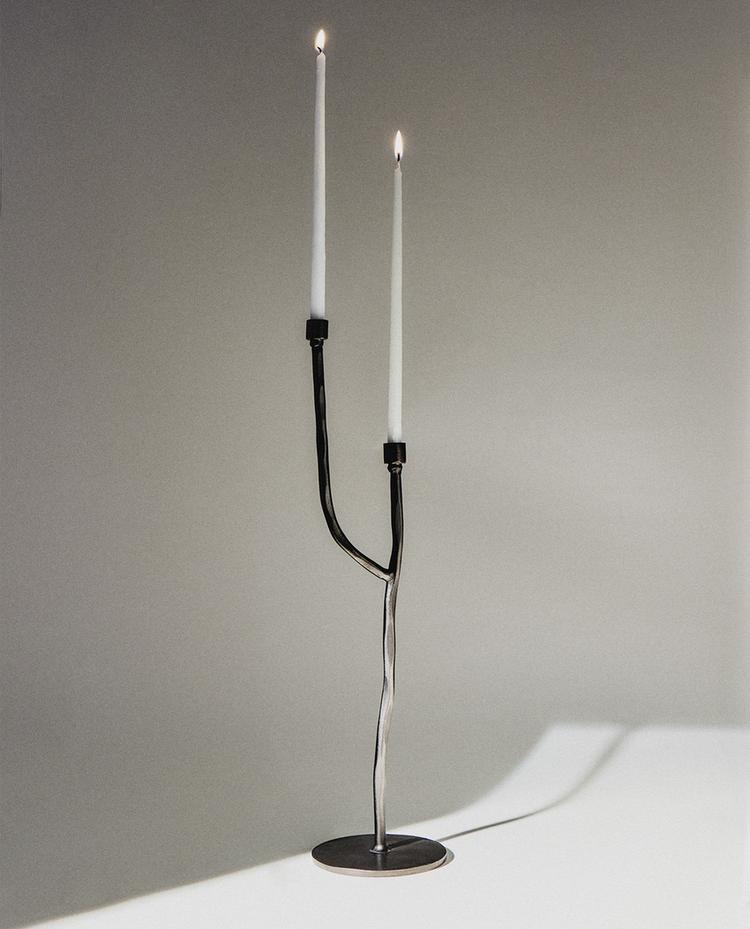 Kerzenständer aus matt-schwarz lackiertem Eisen, der sich von einem einfachen runden Fuß erhebt. Seine Struktur imitiert die Form eines Astes, der sich in zwei Arme auf unterschiedlichen Höhen verzweigt.