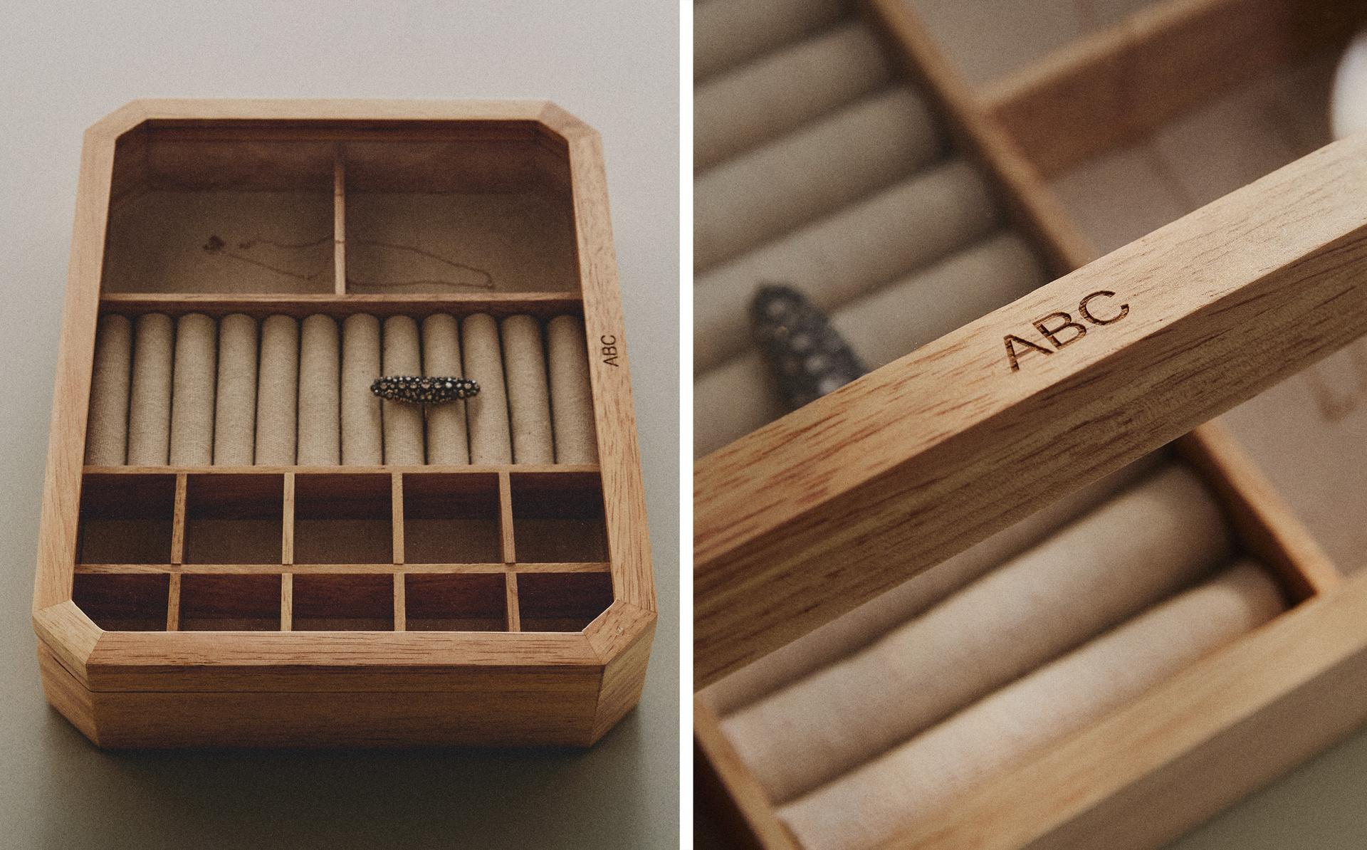 Zu den herausragenden Artikeln in dieser Kategorie gehören die maßgefertigten Schmuckkästchen, die in Naturholz- und Metallausführung erhältlich sind. Sie sind für die Aufbewahrung und Organisation von kleinen Schmuckstücken, Uhren oder Accessoires gedacht und verbinden Funktionalität und Design. Ihre klare Struktur und neutrale Ästhetik machen sie zu dekorativen Elementen, die in Regale, Sideboards oder Beistelltische integriert werden können. Die Personalisierung mit Initialen verleiht jedem Schmuckkästchen einen einzigartigen Wert und macht es zu einem aussagekräftigen und visuell harmonischen Objekt.