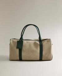 Bolsa de viaje confeccionada en piel y ante, cierre de cremallera, asa corta y asa larga ajustable con mosquetones para poder retirarla fácilmente. Incluye etiqueta identificativa de piel para personalizar.