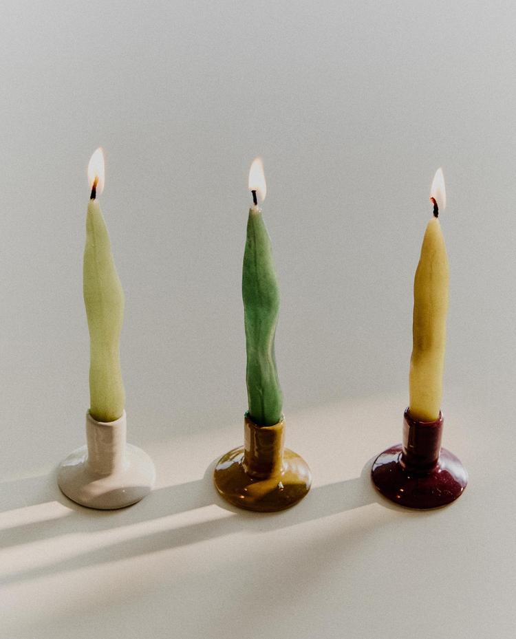 Pack de 3 candelabros elaborados en gres con acabado gloss y diferentes colores.