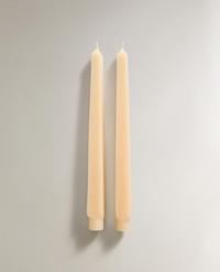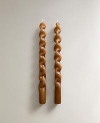 Velas decorativas en cera con diseño alargado y forma ondulada continua, generando una silueta torsionada de mayor volumen. Presentan base recta para apoyo estable y mecha central visible. El pack incluye 2 velas.