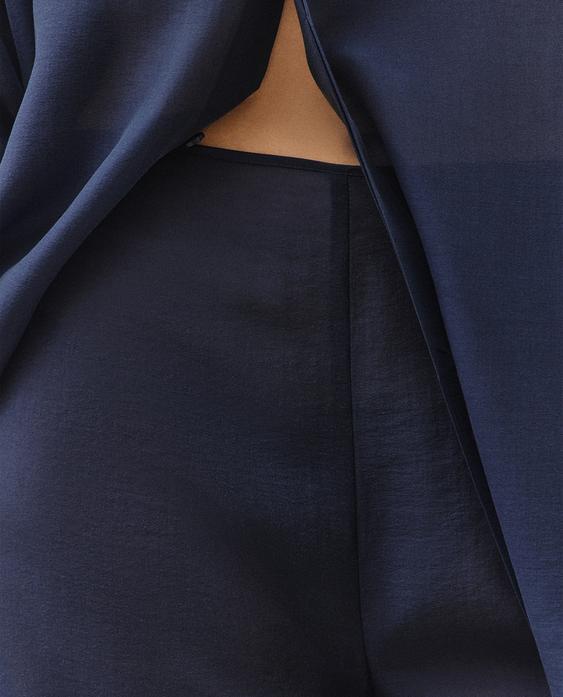 Pantalón semitransparente confeccionado en tejido ligero de caída fluida, con pernera amplia y cintura con detalle elástico en la parte posterior.