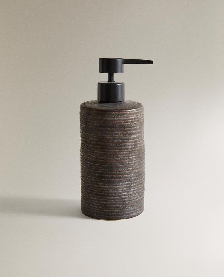 Black ceramic soap dispenser featuring a contemporary design with an artisanal enamelled finish. Its horizontal lines create subtle variations in colour and a unique visual effect on each piece.