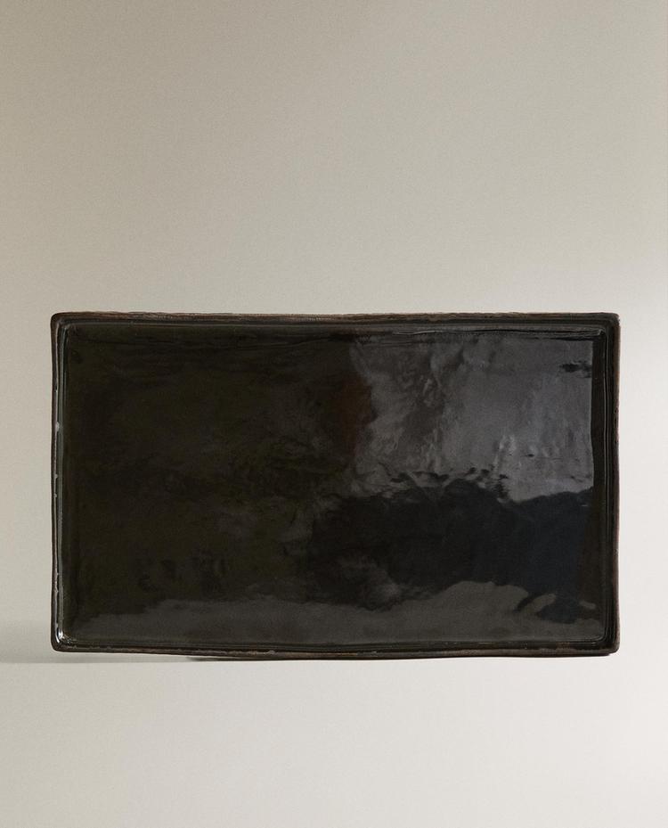 Rectangular black ceramic bathroom tray featuring a contemporary design with an artisanal enamelled finish. Its horizontal lines create subtle variations in colour and a unique visual effect on each piece.