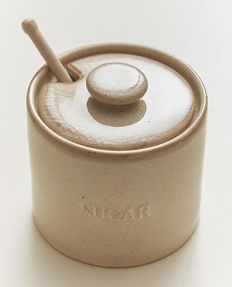 Stoneware sugar bowl with a matching lid and spoon, consisting of a cylindrical container with a top lid, featuring an opening and raised slogan integrated into the body.
