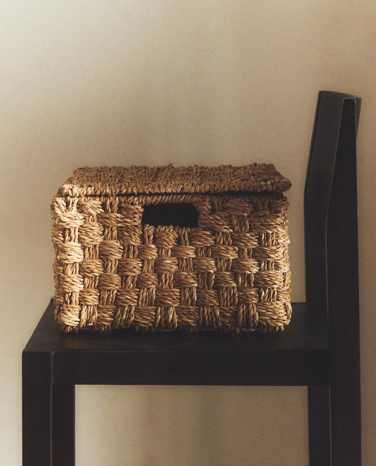 Obdélníkový úložný koš s víkem, kovovou konstrukcí pokrytou splétaným materiálem seagrass a integrovaným uchem vpředu.