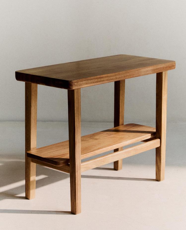 Denne bænk i akacietræ skiller sig ud både for sin alsidighed og sit design og giver rummet elegance og funktionalitet.