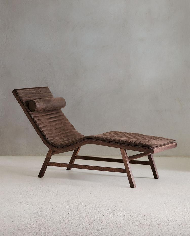 Denne chaiselong i træ minder os om den klassiske havestol, som Vincent Van Duysen plejede at have i sin gamle Antwerpen-lejlighed. Dens enkle silhuet og kurveformede og anderledes design gør dette møbel til stjernen i rummet, både indendørs og udendørs. Fremstillet af farvet egetræ og leveret med en vatteret hynde og en pude med fyld, begge polstret i skind, helt i samklang med træstrukturens delikatesse og elegance.