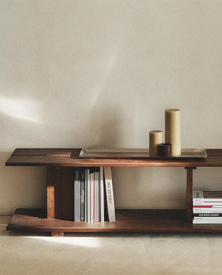 Long elm wood shelving unit with two shelves. Supports up to 75 kg.