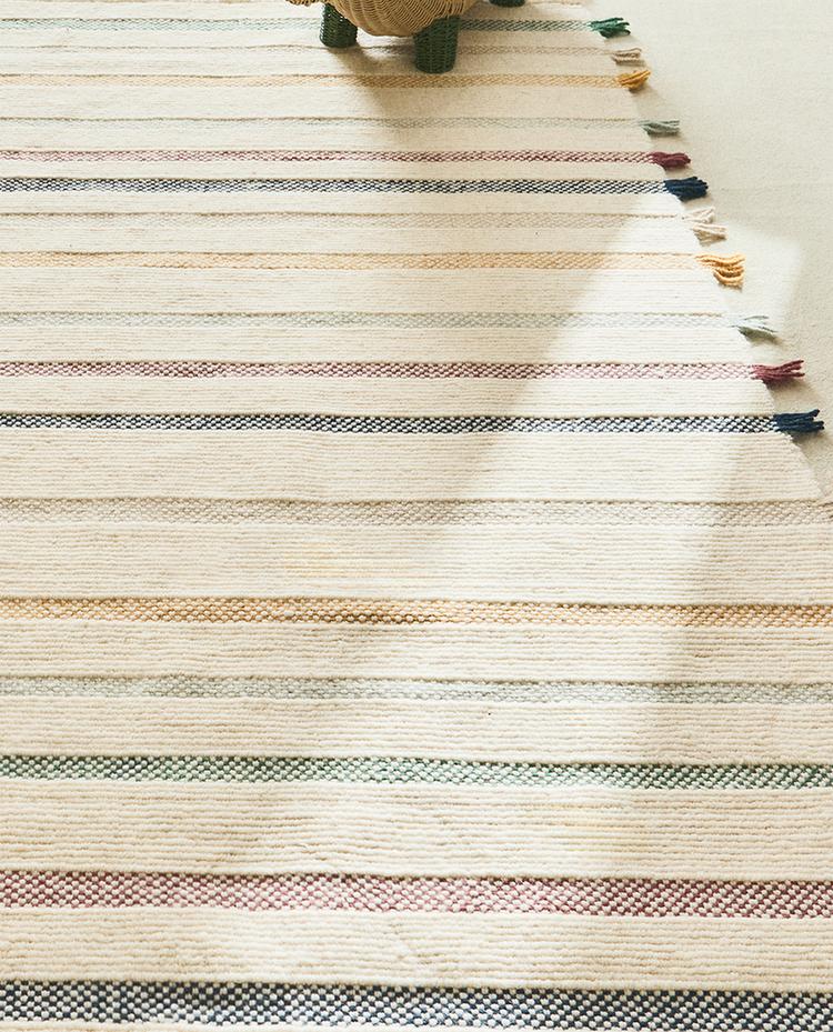 Kids' wool rug with a multicoloured stripe design and contrast fringing at the ends. Available in carpet runner size.
