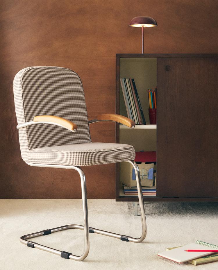 Kids' chair with a metal sled-base structure in a chrome finish. The seat and backrest are upholstered with a check print, and the armrests feature a wood finish.